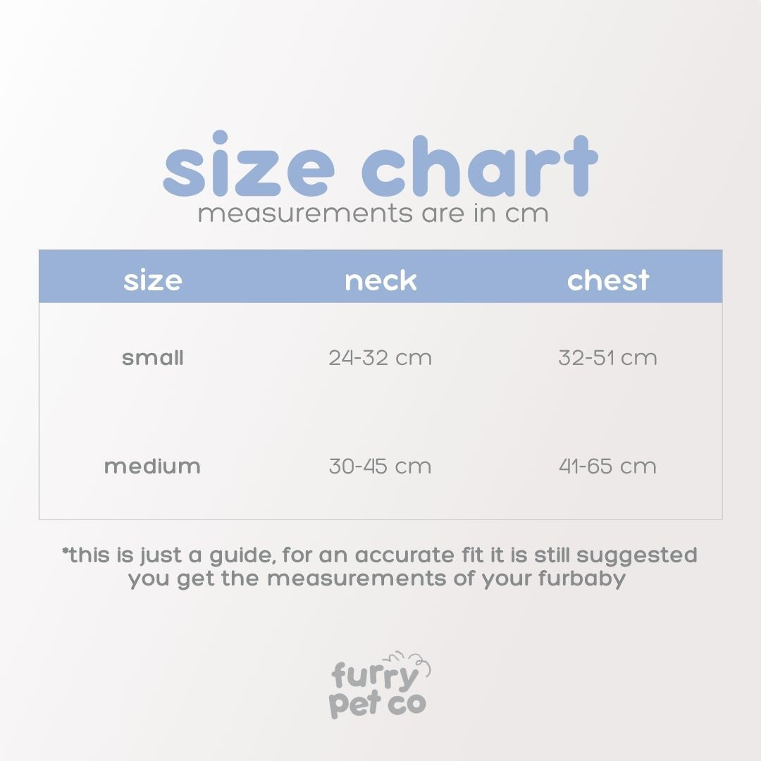 Size guide is in the product photos. We recommend you take your pet's neck & chest measurements to ensure proper fit.